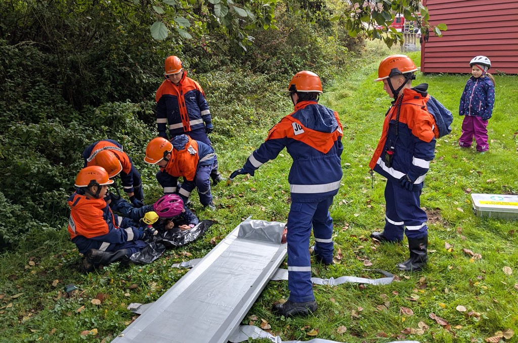 Kaum zurück in der Wache, ertönte erneut der Alarm: Zwei Mädchen waren mit ihren Rollern zusammengestoßen und eine Böschung hinabgestürzt. Dank schnellen und professionellen Handelns konnten diese beiden „Verletzten“ erfolgreich gerettet werden. Besonders anspruchsvoll wurde es am frühen Nachmittag: Gegen 13.30 Uhr galt es, ein Szenario mit ausströmendem Gas aus einer defekten Gasflasche zu bewältigen. Neben der eigentlichen Gefahr mussten die Jugendlichen dabei auch zahlreiche Schaulustige, die immer wieder in den Gefahrenbereich drängen wollten, konsequent auf Abstand halten. Auch diese Herausforderung meisterte das Team mit Bravour.