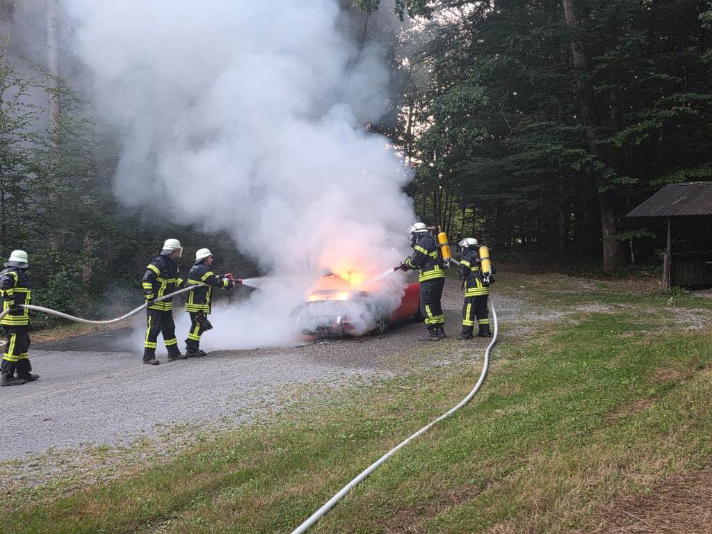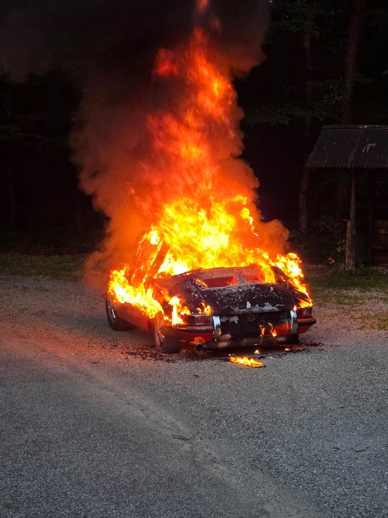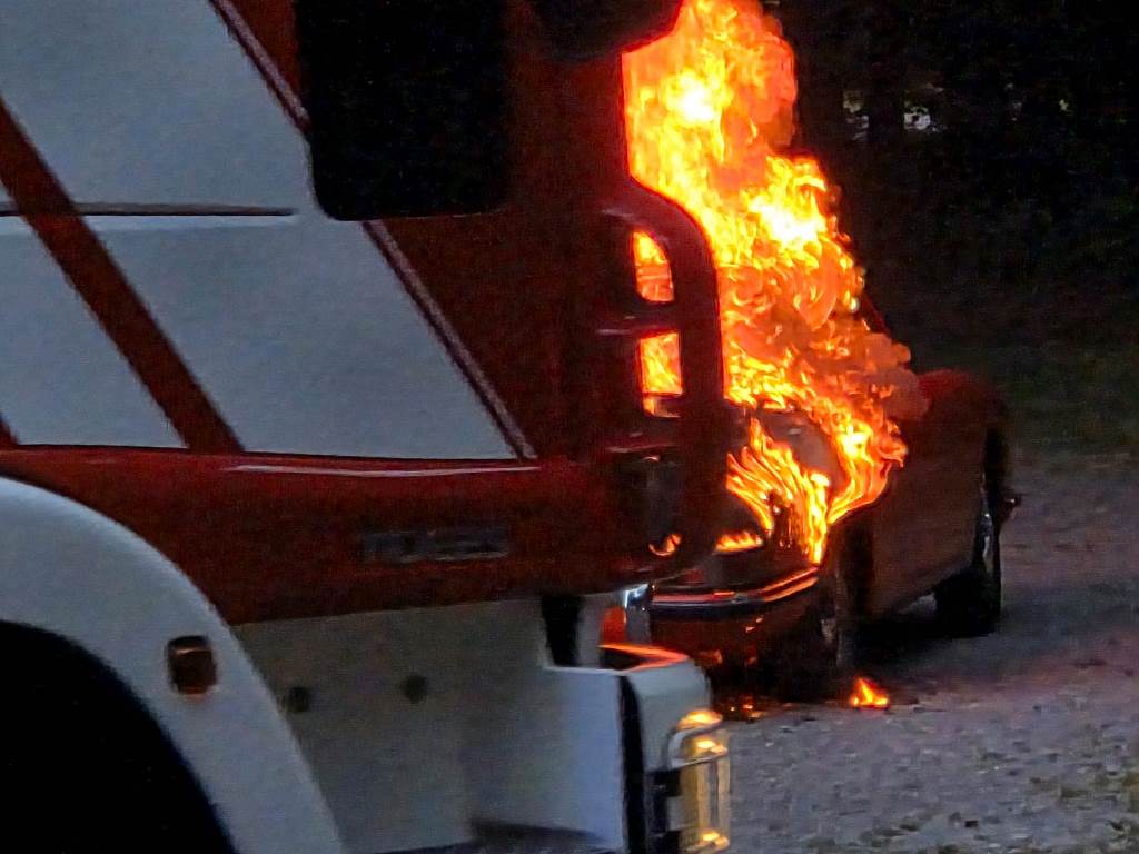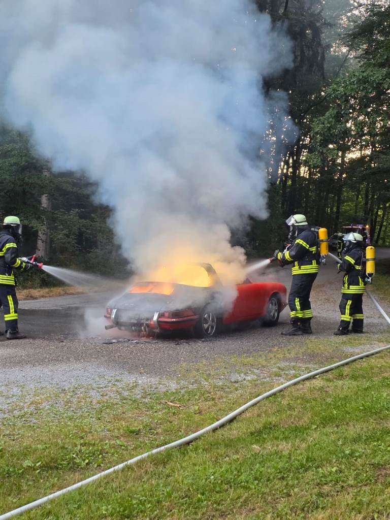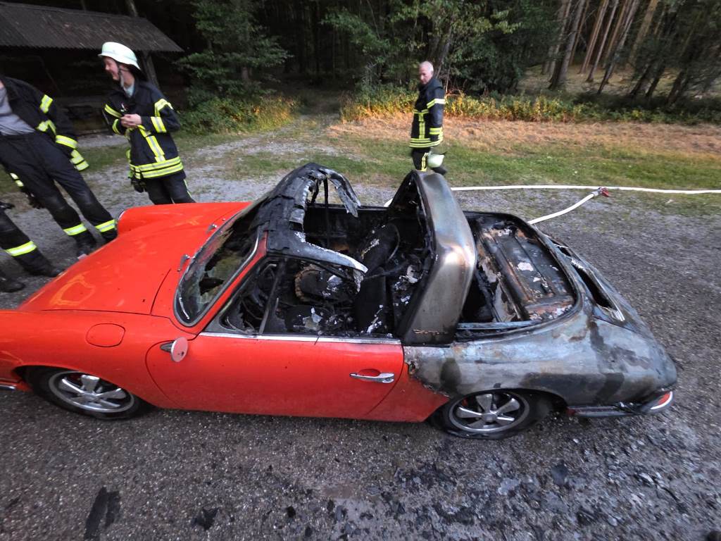 Mörschenhardt | Aus ungeklärter Ursache fing ein alter Porsche feuer und brannte komplett aus. Daran konnte auch das schnelle eingreifen der Abteilungen Mudau, Donebach, Mörschhardt und Schloßau nichts ändern. Glücklicherweise konnten sich der Fahrer und Beifahrer rechtzeitig in Sicherheit bringen.